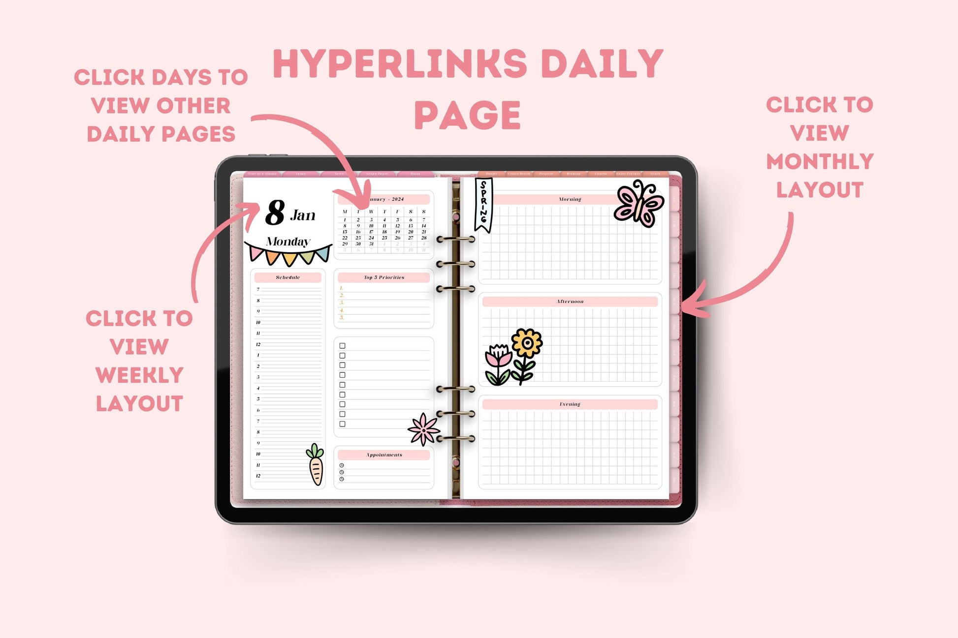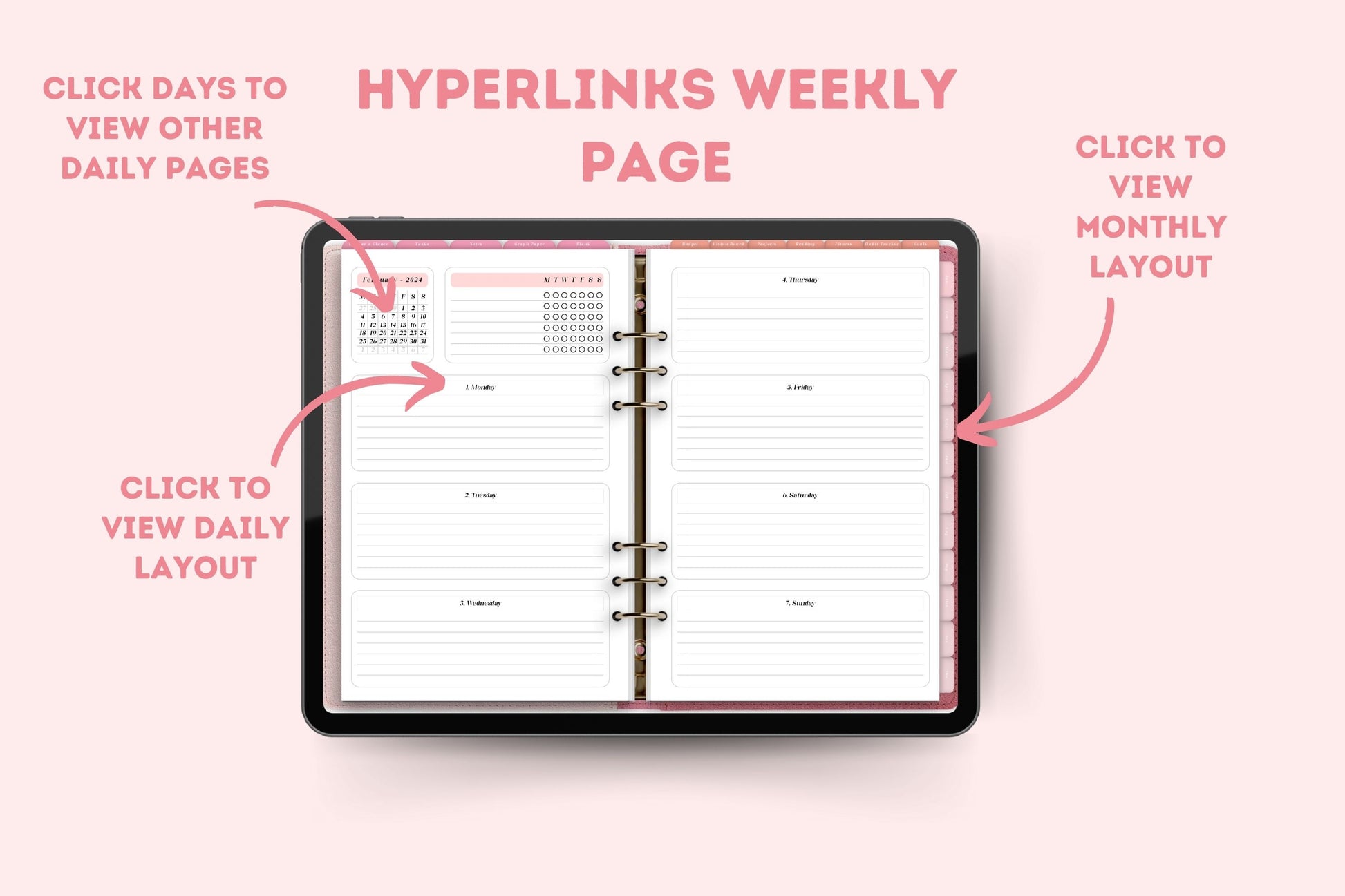 Retro Pink 2024 Horizontal Dated Hyperlinked Digital Planner