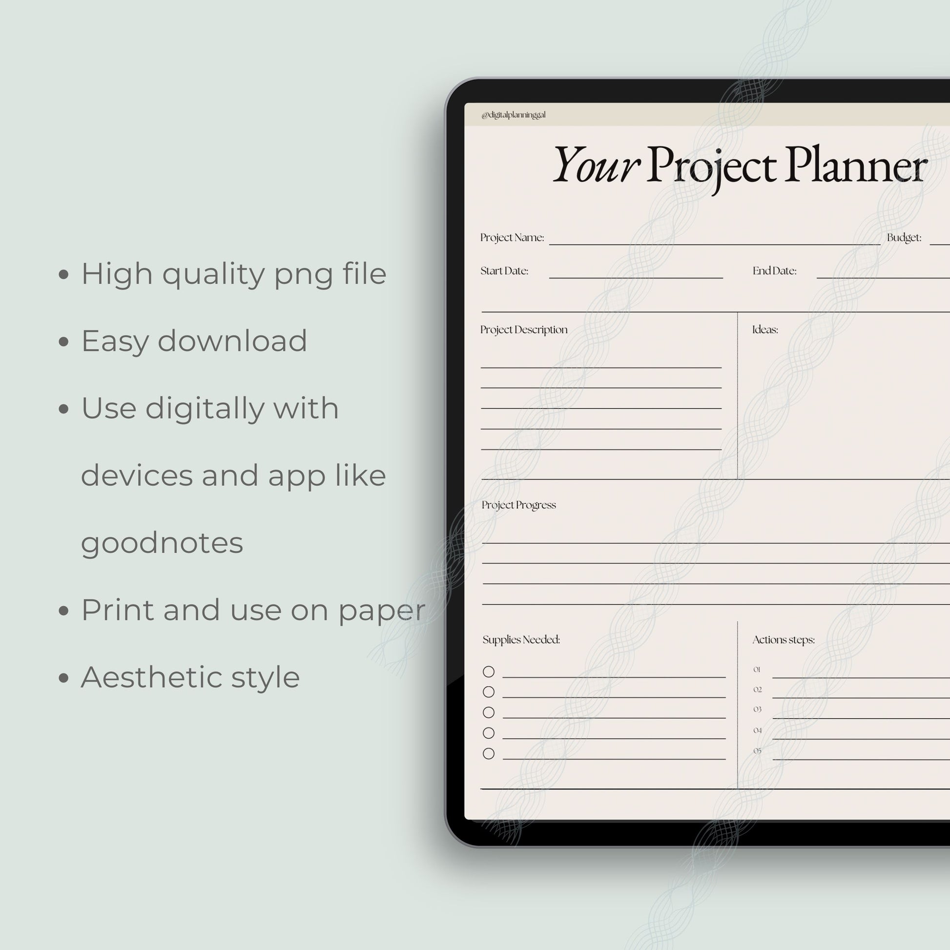 Downloadable file including PNG file . Open this file and click the button to download. Save to photos and import into apps like goodnotes or notability to write on using iPad or tablet. Print at 100% for a physical planner page.